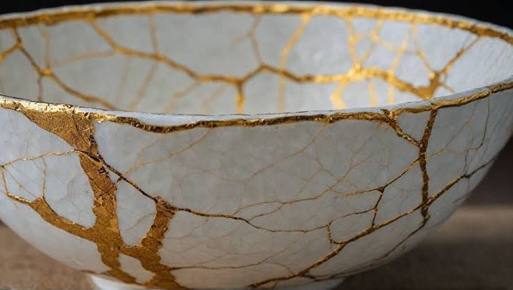 When we look to the Japanese philosophy of Wabi-Sabi, kintsugi is the practice of joining broken pieces of pottery together with gold.